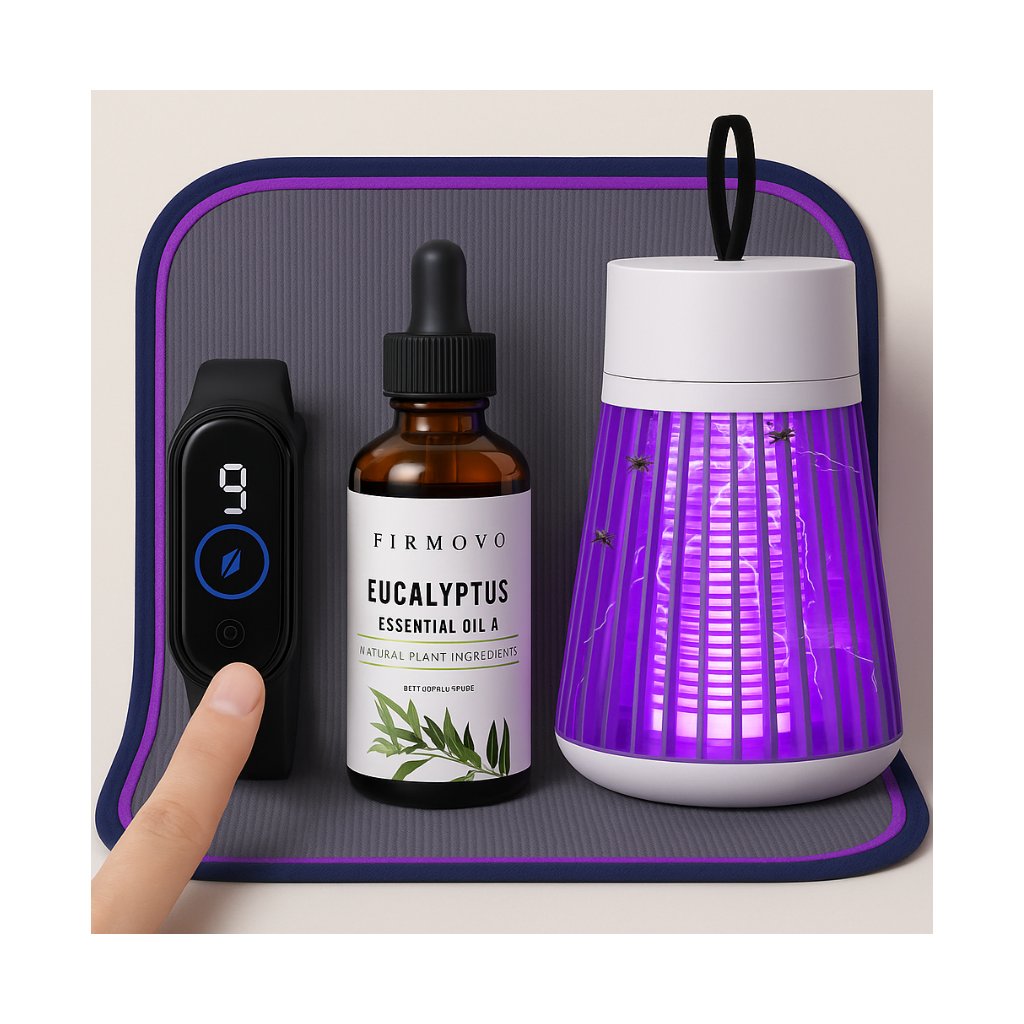 Ultrazvukový náramok funguje diskrétne – stačí ho nabiť cez USB a môžete ho nosiť von aj dovnútra. Lampa s UV svetlom je úplne tichá, neobsahuje chemikálie a je vhodná aj do spální či detských izieb. Citronelový olej odpudzuje hmyz jemnou citrusovou vôňou – použiteľný v aróma difuzéri alebo priamo na pokožku.