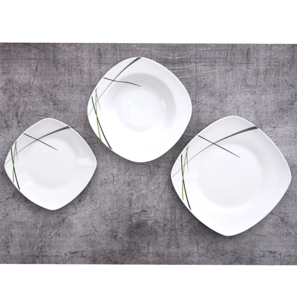 Jedálenská súprava ORION Green je dokonalou voľbou pre každého, kto hľadá spojenie elegancie, kvality a funkčnosti. Vďaka hranatému tvaru tanierov a jemnému zelenému dekoru pôsobí súprava mimoriadne štýlovo a zároveň nadčasovo. Vhodná je nielen na bežné rodinné obedy, ale aj na sviatočné servírovanie, kedy chcete na stole vytvoriť harmonickú a estetickú kompozíciu.