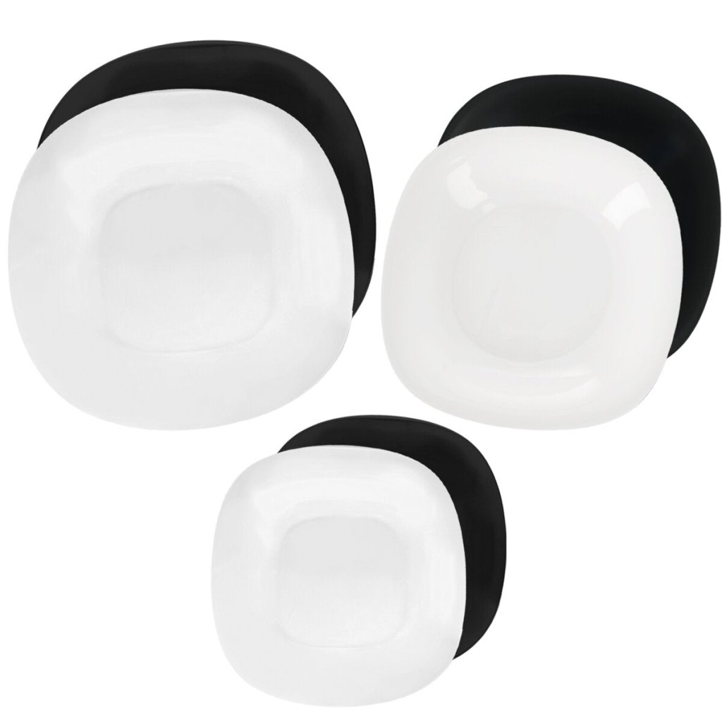 Tanierová sada obsahuje 6 dezertných, 6 hlbokých a 6 plytkých tanierov – každá veľkosť je rovnomerne rozdelená medzi čiernu a bielu farbu. Hranatý tvar dodáva tanierom osobitý štýl a umožňuje estetické servírovanie každého chodu. Vhodná do umývačky aj mikrovlnnej rúry (do 100 °C).