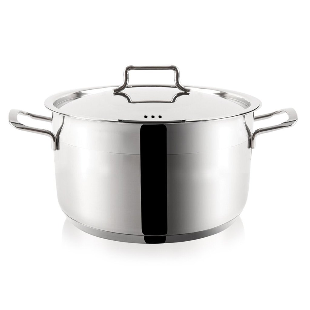Kvalitná nerezová oceľ poskytuje vysokú odolnosť a bezpečnosť pri styku s potravinami. Sendvičové dno zaručuje efektívne vedenie tepla a znižuje spotrebu energie. Elegantné leštené prevedenie dopĺňa praktickosť – nádoba sa jednoducho čistí a pôsobí reprezentatívne v každej kuchyni.