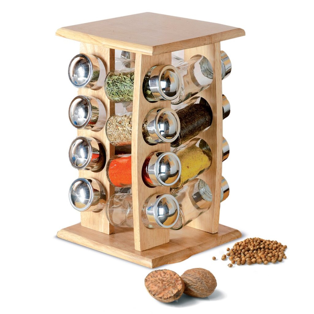 Každá nádoba je vybavená plastovým sypátkom a uzáverom s pochromovanou povrchovou úpravou, ktorá dodáva celej sade moderný a čistý vzhľad. Všetko je uložené v otočnom stojane z tvrdého dreva, ktorý sa pohodlne zmestí aj do menšej kuchyne a zaručuje okamžitý prehľad a rýchly prístup ku všetkým druhom korenín.