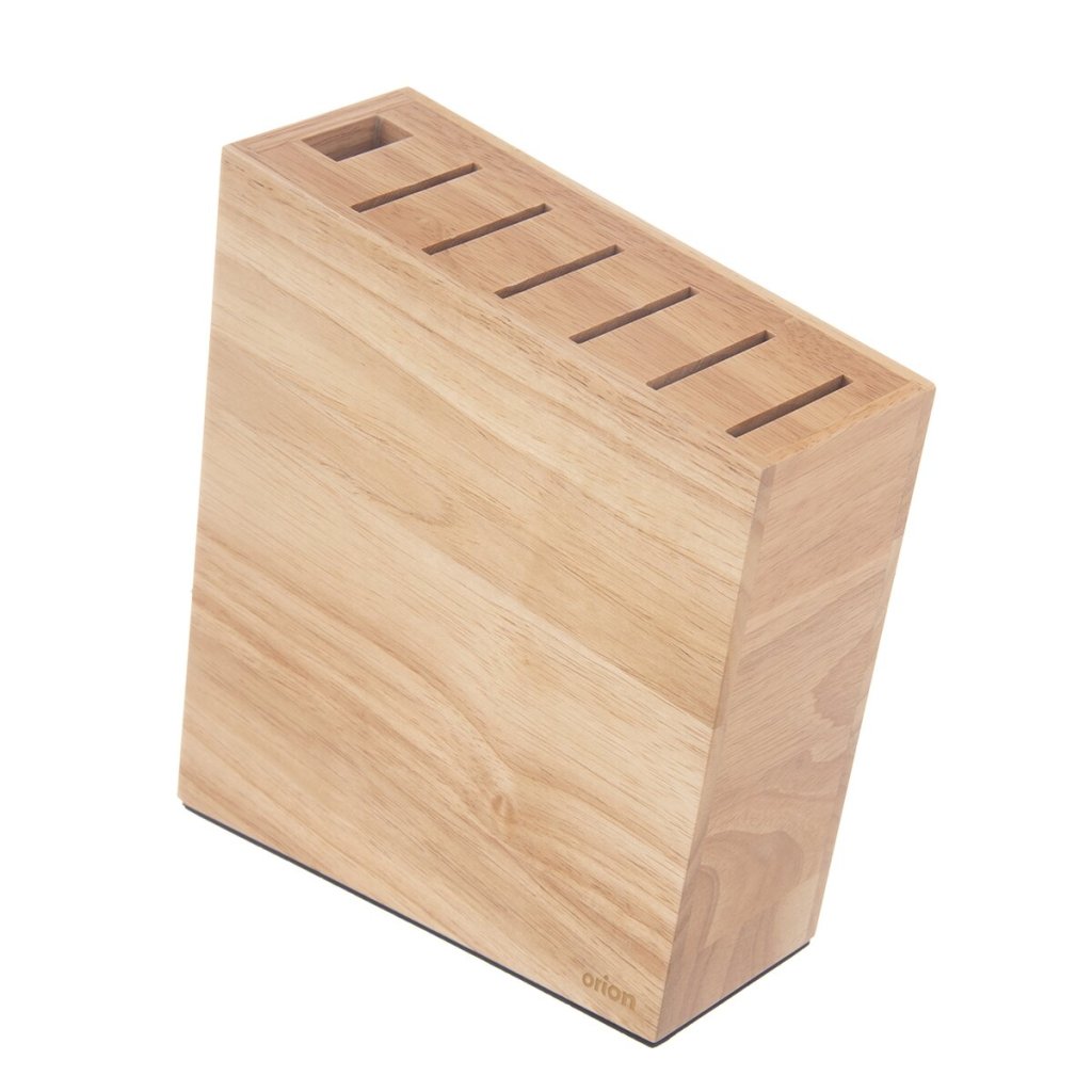 Stojan na nože ORION z gumovníkového dreva kombinuje praktickosť a estetiku – poskytuje prehľadné, bezpečné a hygienické riešenie pre uloženie nožov priamo na kuchynskej linke. Vďaka presne tvarovaným otvorom sa do stojana zmestí 6 rôznych nožov a jedna ocieľka alebo nožnice, ktoré tak už nemusíte skladovať v zásuvkách, kde sa môžu poškodiť. Pevná konštrukcia z gumovníkového dreva je nielen vizuálne atraktívna, ale aj trvácna a ľahko udržiavateľná. Protišmyková pena EVA na spodnej strane zabezpečuje stabilitu a zároveň chráni nábytok pred poškriabaním. Ideálne riešenie pre každého, kto chce mať poriadok, bezpečnosť a dizajn v jednom produkte.
