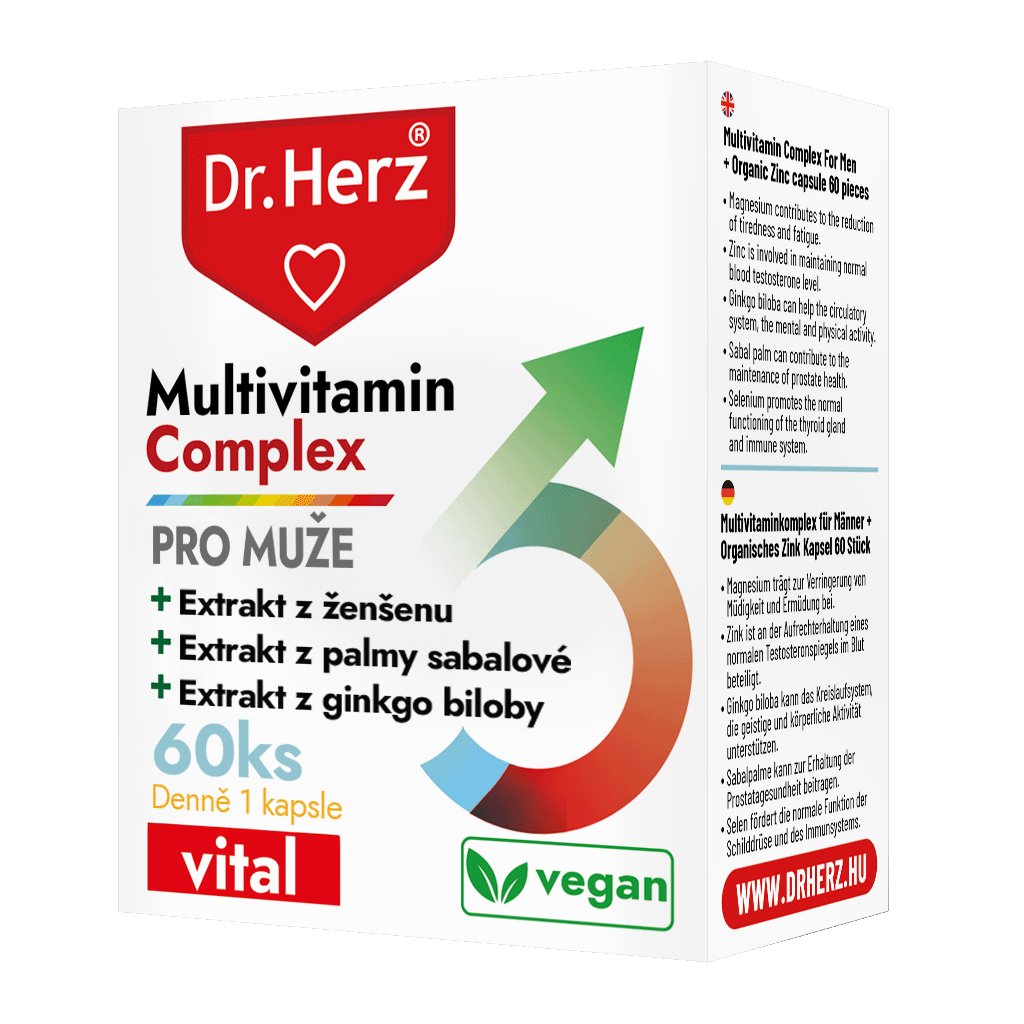 Dr. Herz Multivitamin pre mužov je funkčný doplnok navrhnutý pre špecifické potreby mužského organizmu. Obsahuje silné bylinné extrakty ako ženšen, ginkgo biloba a sabalpalmový extrakt, ktoré sú známe svojimi priaznivými účinkami na fyzickú aj mentálnu výkonnosť. Obsah organického zinku podporuje normálnu produkciu testosterónu, zatiaľ čo magnézium a selén udržiavajú energetickú rovnováhu a chránia bunky pred oxidačným stresom. Tento multivitamín je ideálny pre aktívnych mužov, ktorí si chcú udržať dlhodobú vitalitu a výkonnosť.